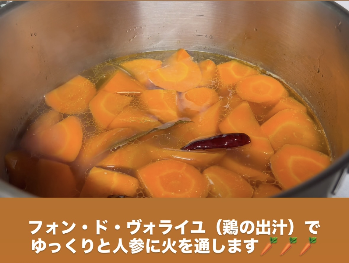 あらかじめ準備したフォン・ド・ヴォライユ(鶏の出汁)にエキストラヴァージンオリーブオイルを加え、人参にゆっくり丁寧に火を通して、身体に優しい人参グラッセ(的なもの)を作るところからスタート。