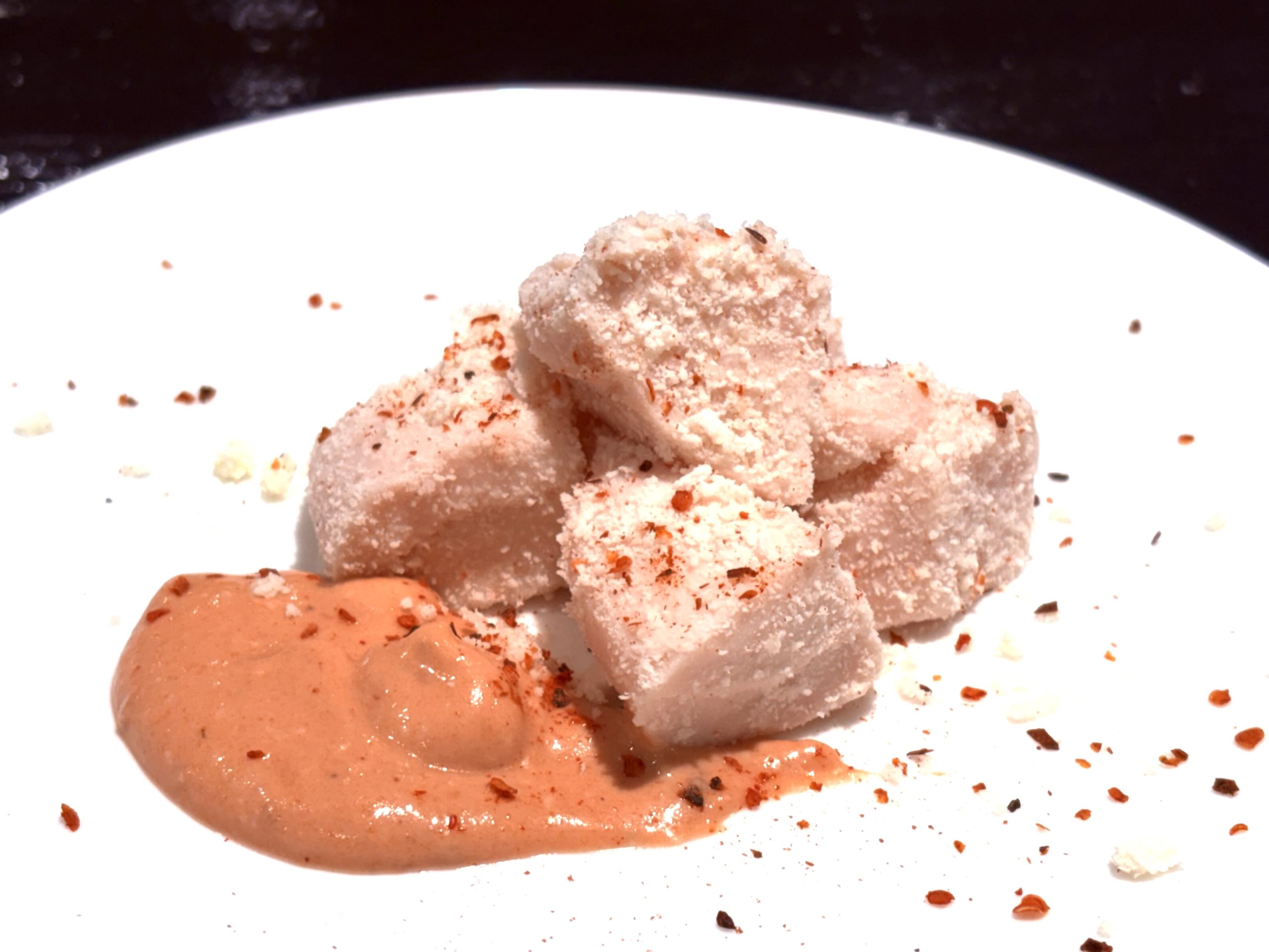 ピンク色のクリーミーなソースを添えたチキンのオードブルをご用意いたしました。