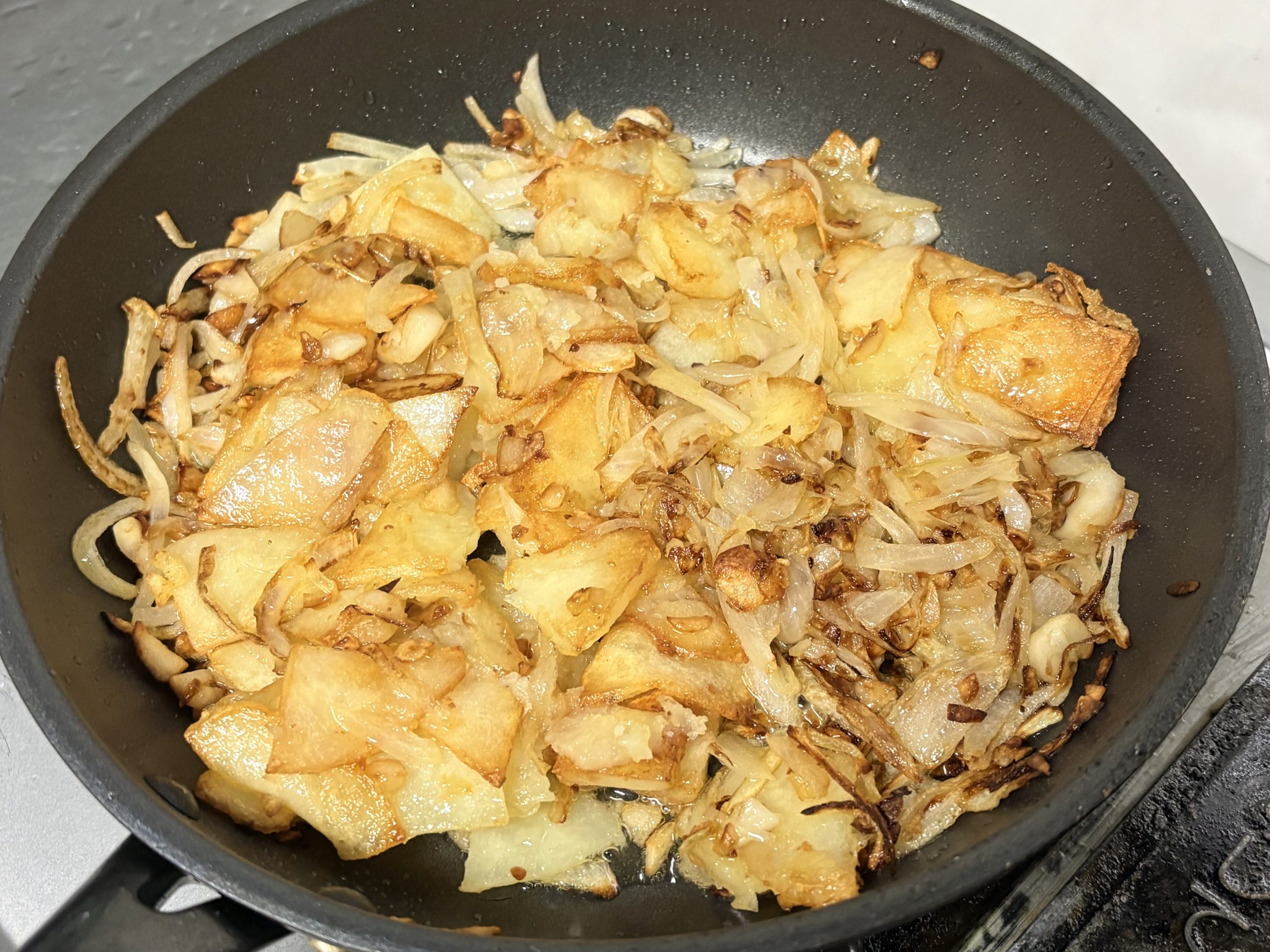 一方じゃがいもは、しっかり熱を加えたいので、ヒマワリ油で中火で炒めます🌻(エクストラバージンオリーブオイルは高温に弱い=酸化しやすいため)